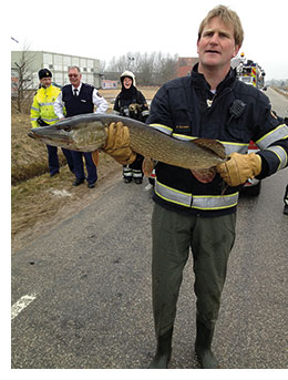 Hier werd een flinke snoek aangetroffen die niet meer weg kon komen door het lage waterpeil. Dit werd een nieuwe missie voor de brandweer: het op vakkundige wijze vangen van deze snoek en het dier vervolgens weer in dieper water uitzetten.